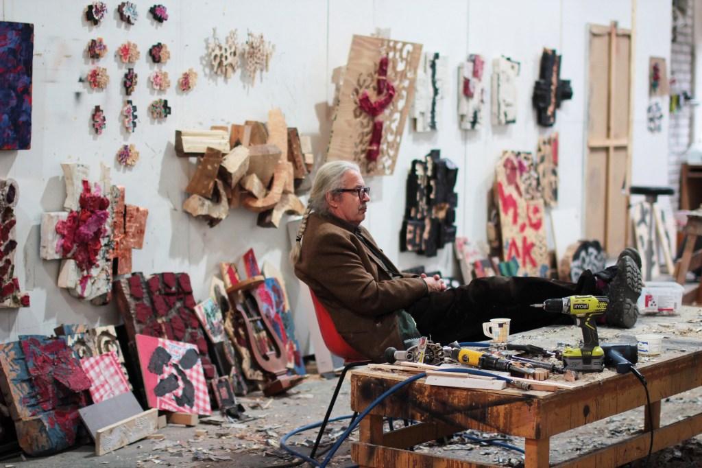Kuopiolainen taiteilija Pauno Pohjolainen (s.1949) työskentelee synnyinseudullaan itäsuomalaisen jylhän metsämaiseman ympäröimänä. ”Veistetyiksi maalauksiksi” kuvailtujen suurikokoisten veistosten materiaalina on useimmiten puu ja väri.